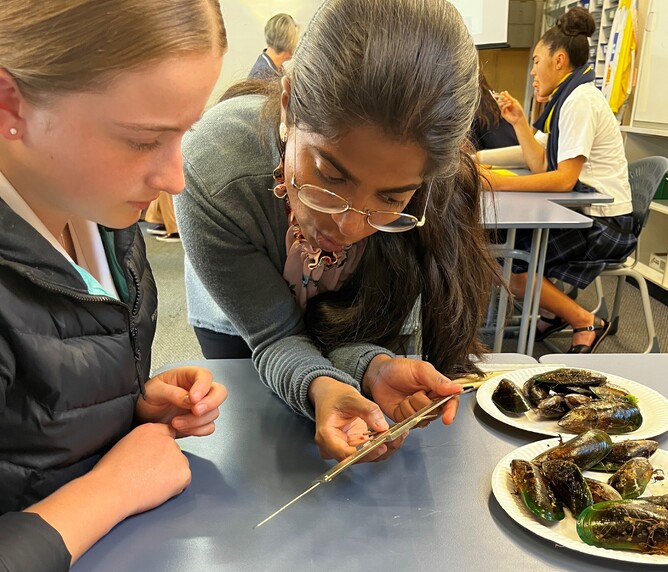 The students were told the optimal size for the half shell market was the medium mussel (85mm - 100mm in length) and that these are processed at the Havelock Factory.